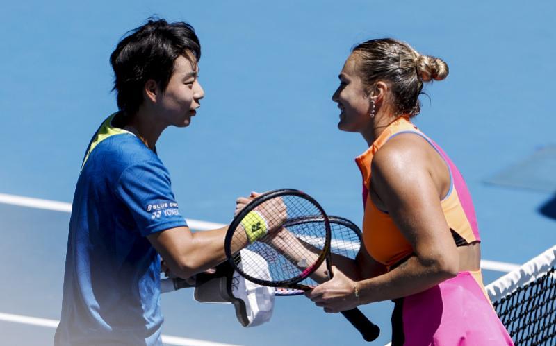 中国选手白卓璇(左)与白俄罗斯选手萨巴伦卡赛后握手致意。 当地时间1月21日,在墨尔本进行的2026年澳大利亚网球公开赛女单第二轮比赛中,中国选手白卓璇0比2不敌白俄罗斯选手萨巴伦卡,无缘下一轮。 新华社记者 马平 摄