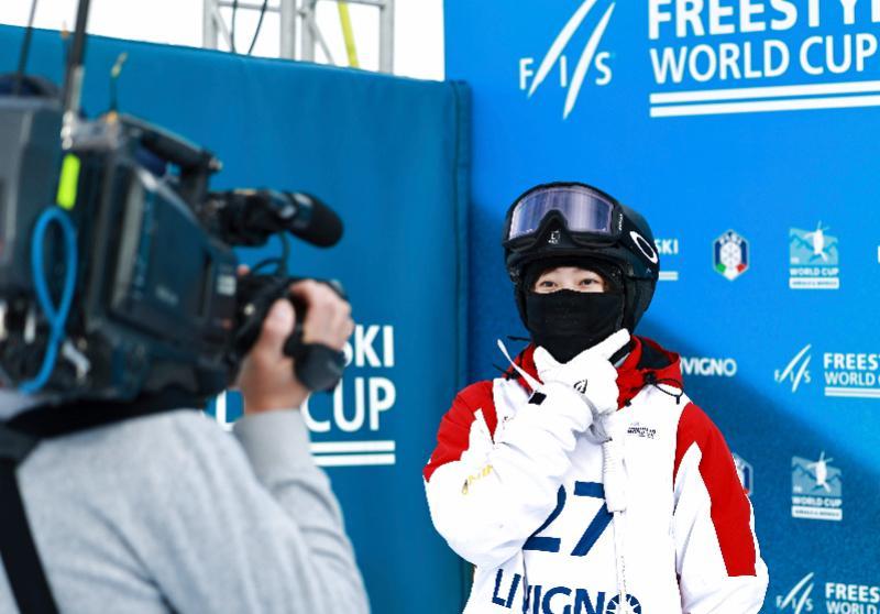 2025年3月11日,黎睿霖在国际雪联自由式滑雪世界杯(利维尼奥站)女子雪上技巧资格赛比赛后。新华社发